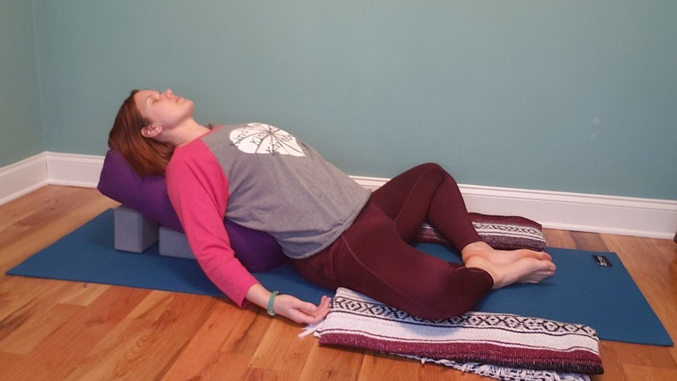 Props you might like to have available: A bolster or pillow or cushion, 3 blankets, 2 blocks or something similar, eye pillow or light scarf for over your eyes